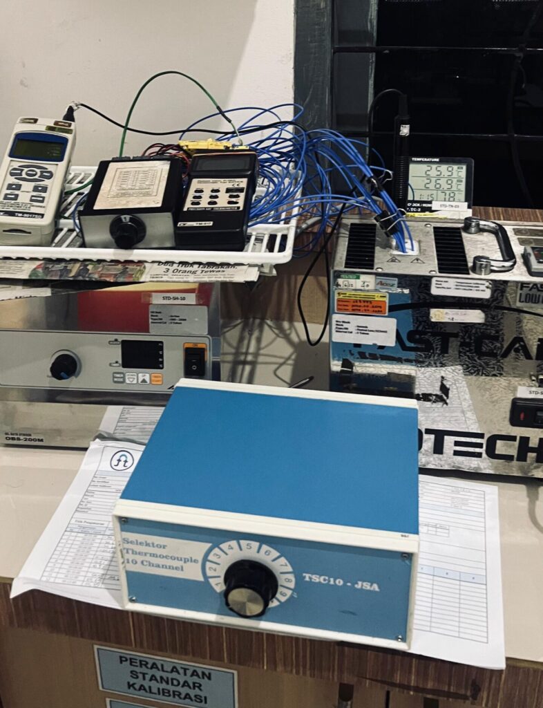 Kalibrasi suhu dilakukan dengan menggunakan dry block calibrator dan thermocouple simulator sebagai standar acuan. Alat ukur suhu multi-channel diuji secara simultan untuk mengetahui deviasi pembacaan terhadap nilai referensi. Seluruh proses dilengkapi dengan pencatatan hasil secara manual maupun digital guna memastikan ketertelusuran terhadap standar nasional.