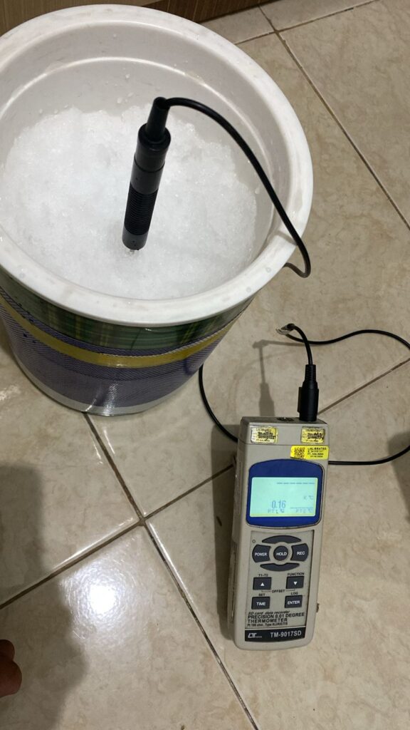 Proses kalibrasi dilakukan dengan metode titik tetap menggunakan campuran es-air (ice bath) untuk menguji ketertelusuran pembacaan suhu terhadap titik referensi 0°C. Sensor suhu dicelupkan dalam media es-air stabil, dan pembacaan dicatat serta dibandingkan dengan standar acuan. Metode ini umum digunakan dalam verifikasi alat ukur suhu seperti thermometer digital atau sensor RTD.